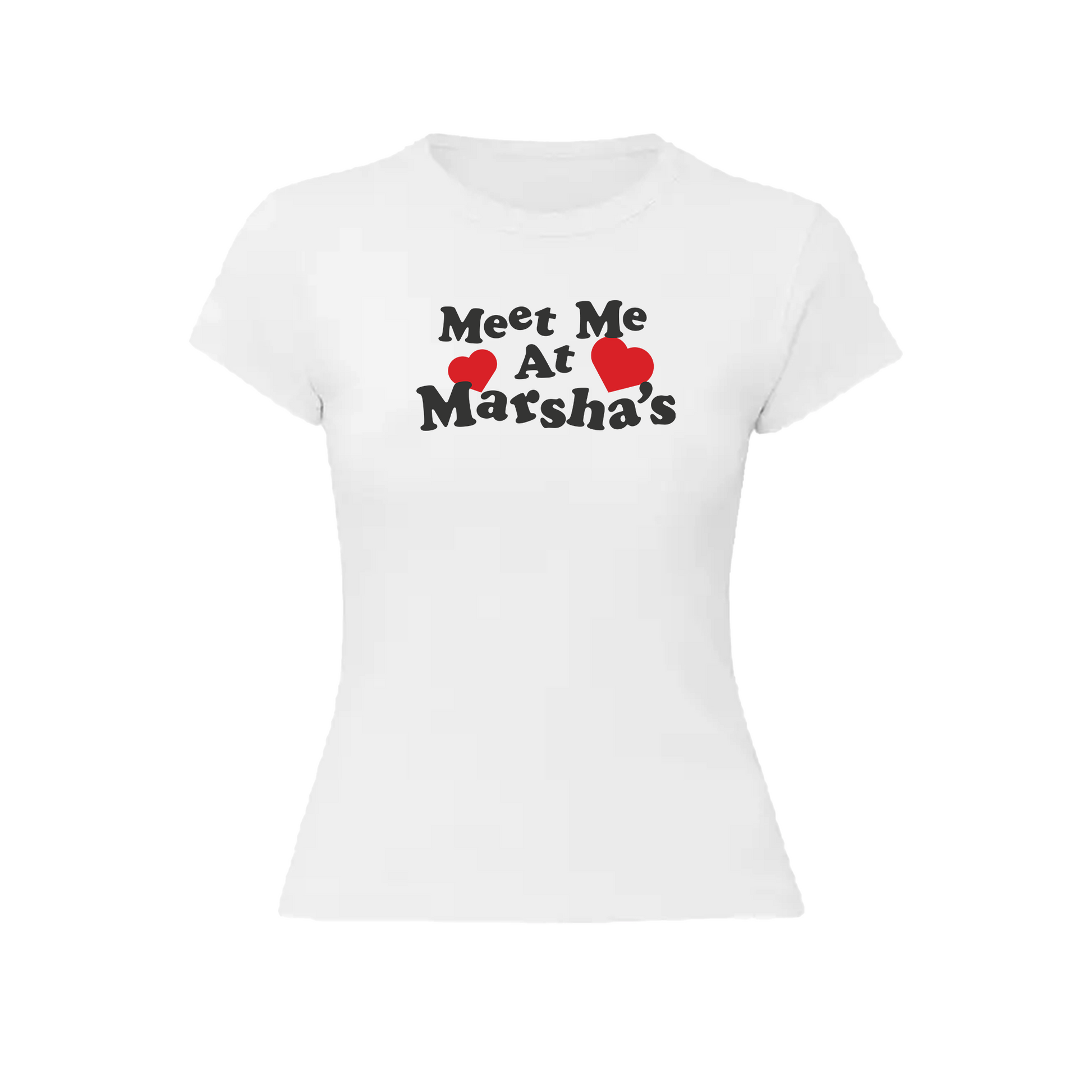 A classic baby tee featuring the text “Meet Me at Marsha’s.” Available in white and black.