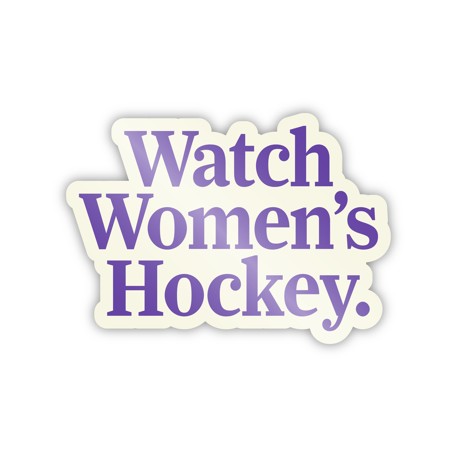 A matte vinyl sticker with text reading “Watch Women's Hockey”. Available in purple and ivory colorways.