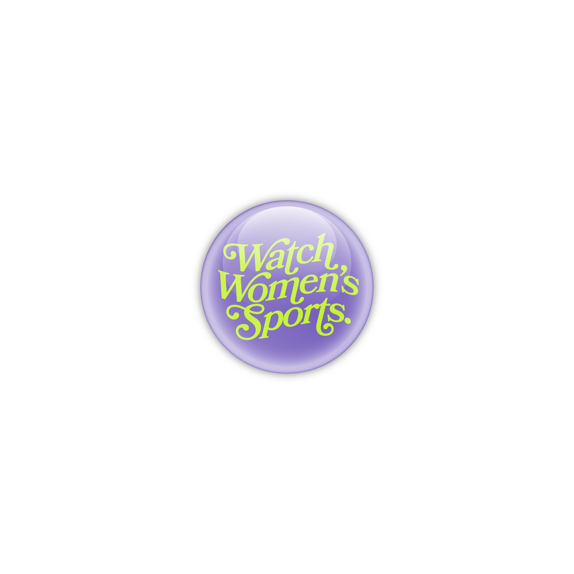 A pinback button with text reading “Watch Women's Sports”. Available in purple and yellow colorways.